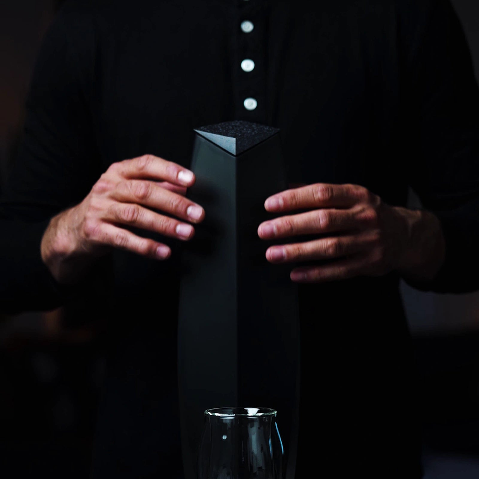 Rebelling against traditional squat bodies and ornamental stoppers, this sleek minimalist vessel sidesteps the light, pivots on its axis, and lands its epic weight on the earth. The lean, long, svelte form of the glass plays with the Norlan design DNA, elongating and pulling at its skin. The stopper is milled, a stealth night flying form with the radar signature of an atom.